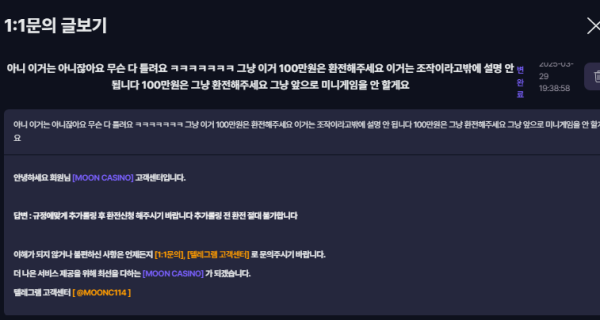 지인들 먹튀소식이많네요 문카지노 먹튀입니다 베픽 배너라 믿고 가입해서 첫환전 잘 나오길래 70충해서 미니게임 이것저것 몇개 베팅해서 조금 올라가자마(260만원정도?) 자 사이트에서 갑자기 쪽지와서 와이사다리5분 현 보유에서 롤링 300% 치라고해서 그건 뭔 게임이냐 아예 처음들어보는게임이다 라고 하니 이걸로만 치라고 다른게임 베팅하면 몰수라고 해서 롤링 쳤더니 1승 19패인가 했네요 연패 누적으로 세보니 14연패입니다. 고액까도 틀리고 소액까도 틀리길래 3만원씩 4줄만 14번 계속갔는데 3줄이 14개 나오네요(밑에 사진첨부하겠습니다) 보유금액 51만원까지 녹아서 자기네들 자체게임 올려놓고 정정당당하게 승부보라고 명분없으니까 뒤로 죽이냐고 하니까 문카지노관리자 애비가 남산공원정자에서 할카스한테 플러팅해서 5만원주고 떠바리치려고 여관방 들어가서 팬티벗자마자 할카스보지에꼴려서 정액 나오는 속도급으로 사이트 잘렸답니다. 텔레그램으로 연락하니 사이트 협박으로 탈퇴처리 한다고하고 텔레그램 고객센터도 차단했다네요 배너달고 명분 만들어서 먹튀하는게 능지가 모자라는 집단임은 충분히 인증한듯합니다.